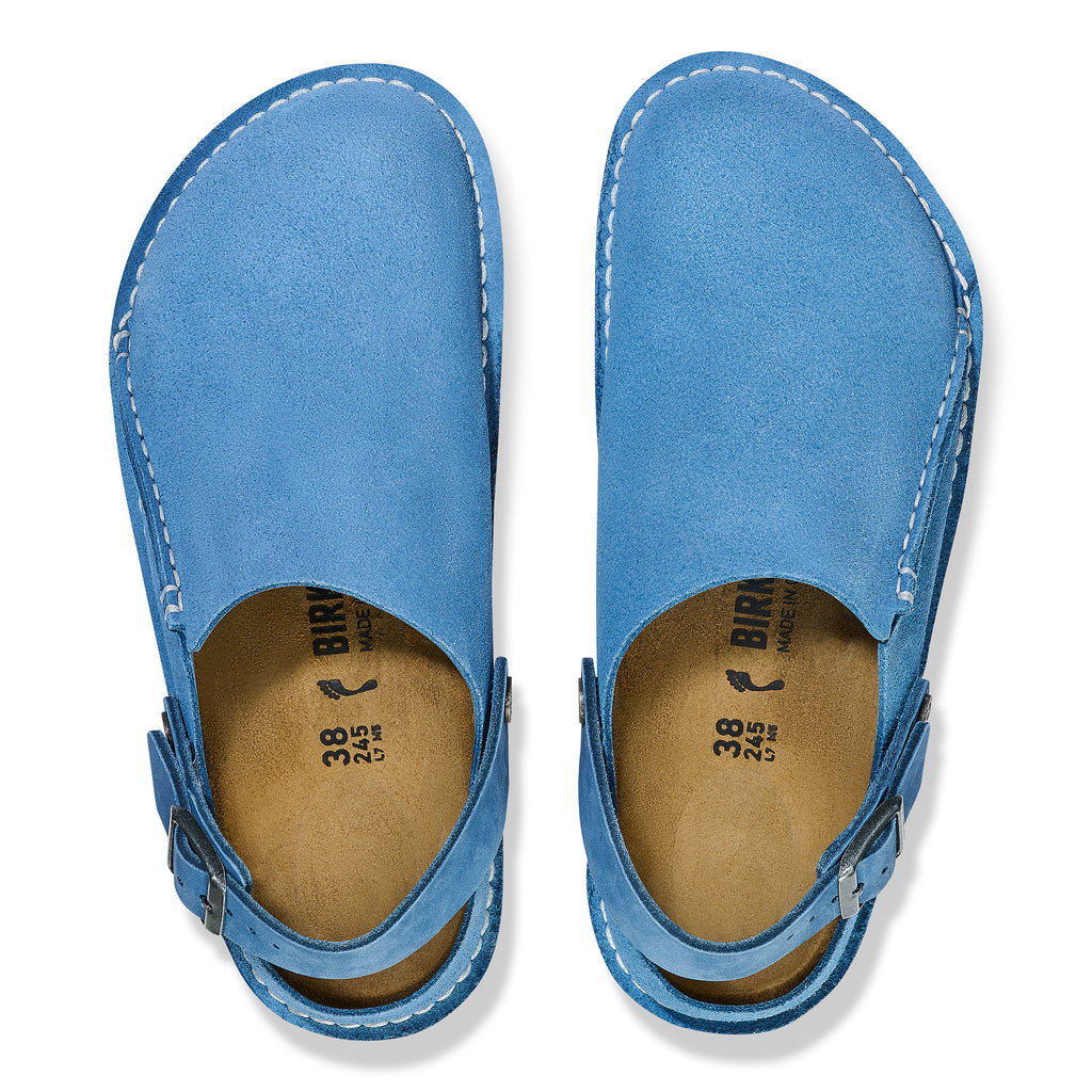 The BIRKENSTOCK Lutry is a slipper that can be worn as a backstrap style or as an open clog thanks to the flexible ankle strap. The footbed can be removed so that you can choose between three different footbed versions. This basic version of this design features our Standard Footbed. It replicates the natural print made by a foot walking on sand and will see you through the day in comfort. Its natural design is down to the upper made from especially soft suede, which hugs the foot like a second skin.